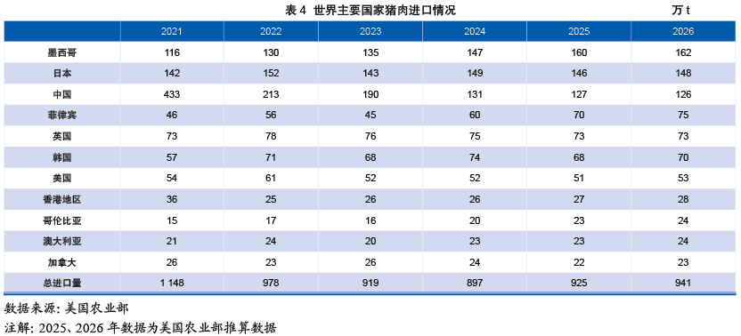 (2) Импортеры: Мексика становится новым центром. После быстрого восстановления производственных мощностей импортный спрос Китая резко упал: с пиковых 4,33 млн тонн в 2021 году до 1,27 млн тонн к 2025 году. Этот фундаментальный сдвиг привел к смещению центра глобального импортного спроса; основными точками роста стали Мексика, Япония, Филиппины и Южная Корея. Среди них импорт Мексики стабильно растет, достигнув 1,6 млн тонн к 2025 году. Страна стала одним из важнейших импортеров свинины в мире, что связано с неспособностью внутреннего производства полностью удовлетворить быстрорастущий спрос.