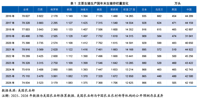 (3) Европейский Союз: продолжающееся снижение производственных мощностей. Под комплексным давлением ужесточения экологического законодательства, высоких производственных издержек и продолжающихся проблем с эпизоотиями, свиноводческая отрасль ЕС была вынуждена сократиться. Конкретные данные показывают, что поголовье свиней в 27 странах ЕС значительно снизилось со 142,65 млн голов в 2016 году до 128,5 млн голов в 2025 году, а объем производства свинины за тот же период упал с 22,95 млн тонн до 21,8 млн тонн.